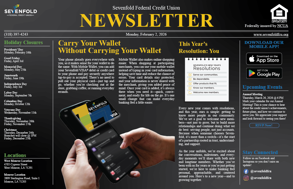 At Sevenfold, transparency is key. Unlike the megabanks, we believe in keeping you informed and involved. Here, you can access our newsletters and annual reports to see exactly how we’re working for you. It’s just one more way we show that being a member of Sevenfold truly means being part of something better.